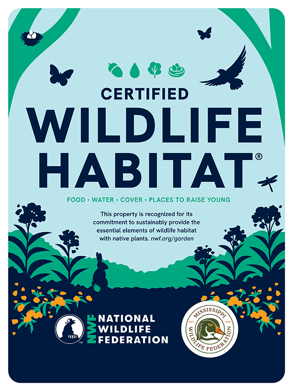 - Exclusive option to purchase attractive garden signs designating your garden as a Certified Wildlife Habitat® with the National Wildlife Federation and Mississippi Wildlife Federation.